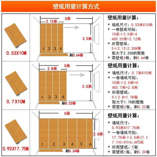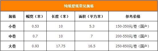 在選擇壁紙的時(shí)候,除了要看適用空間外,還需要看空間的面積,根據(jù)實(shí)際的面積來(lái)挑選不同尺寸的壁紙。純紙壁紙的常見(jiàn)尺寸有三種,0.53x10米/卷、0.7x10米/卷和0.93x17.75米/卷。如:一個(gè)5mx2.5m的墻面鋪貼壁紙,小卷壁紙需要購(gòu)買(mǎi)3卷、而中卷需要2卷、大卷的需要1卷。