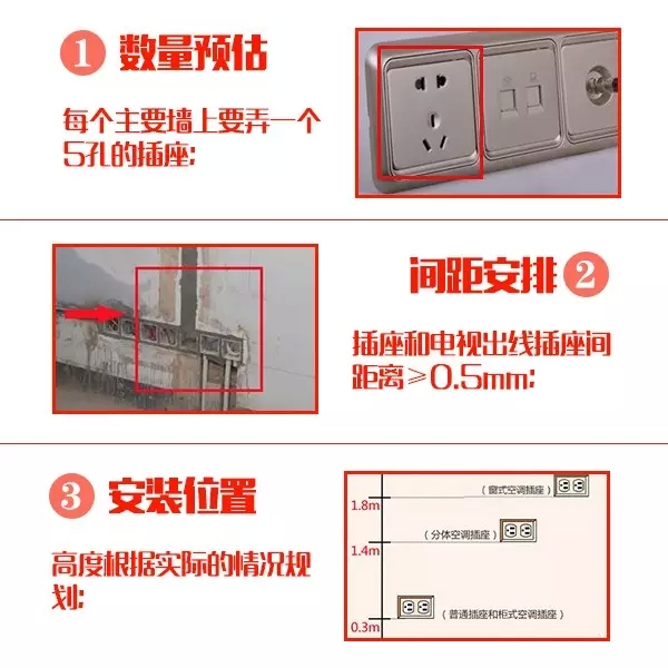 客廳與臥室的插座,應(yīng)保證每個主要墻面均有一個5孔插座,以滿足日常生活所需。插座的位置應(yīng)根據(jù)房屋的設(shè)計來確定,如電視背景墻位置的插座可適當(dāng)多一些,其他位置的根據(jù)需要而定。
