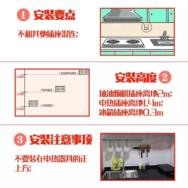 廚房內(nèi)所用電器較多,所以在進(jìn)行電路改造時,一定要想清楚廚房內(nèi)會有哪些電器,具體位置在哪里,想好哪里應(yīng)該預(yù)留電線接口,廚房應(yīng)根據(jù)建筑裝修的布置,在不同的位置、高度設(shè)置多處電源插座以滿足抽油煙機(jī)、消毒柜、微波爐、電飯煲、電熱水器、電冰箱等多種電炊具設(shè)備的需要。這樣就不會留下裝修遺憾。