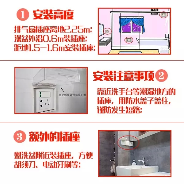 安裝在衛(wèi)生間的插座宜帶開關(guān)和指示燈,如果安裝在潮濕位置的插座,好在插座表面安裝一個防水的蓋子,避免水汽進(jìn)入插座內(nèi),引起短路。