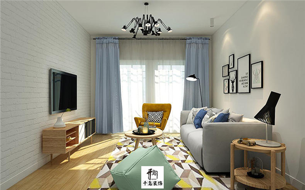 后這種方案非常適合小戶型,墻壁上采用了高級灰色的格調(diào),為了避免客廳看上去太過單調(diào),所以在墻壁上裝飾了一些壁畫,在屋頂射燈的映襯下,顯得非常的時尚漂亮,實木的地板上采用了這種幾何圖案的地毯,顯得更加的年輕時尚。