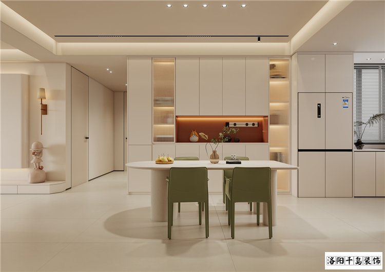 餐廳定制了整面墻的餐邊柜,并且做了嵌入式的冰箱柜,挨著做了西廚的操作臺,解決了廚房過小的問題,并且在視覺上也很美觀!