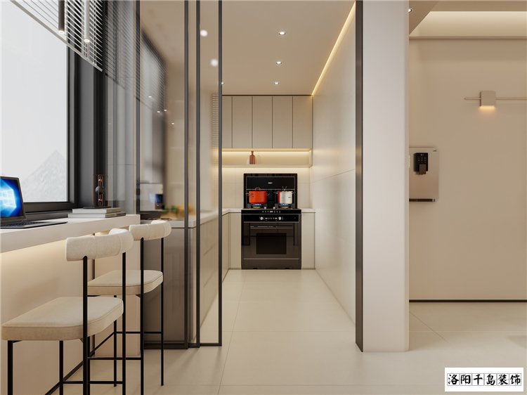 廚房洗切炒依次排開,采用集成灶,頂部的位置也做了吊柜,增加廚房收納,三聯(lián)動的極窄邊框推拉門,連著這餐廳的吧臺,功能性非常強大!
