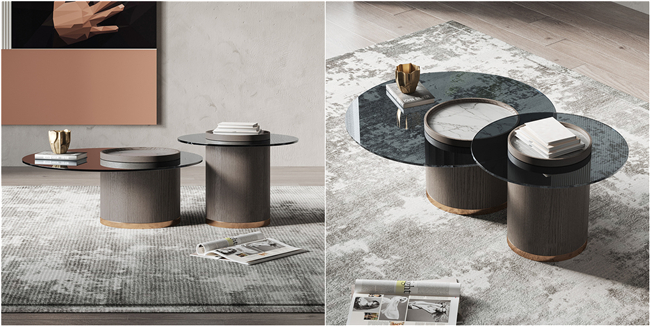 這套意式圓形茶幾打破傳統(tǒng)茶幾的形式,高低款式可以隨意組合,給人一種錯落有致的美。茶幾最吸引我的部分就是桌面的設(shè)計,兩種不同的材質(zhì)結(jié)合,給人一種獨特的美。