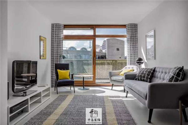 客廳的家具、布藝材質(zhì)都是灰白系的淡雅色調(diào),布藝上的格子印花增添紋理感,點(diǎn)綴色彩的巧妙做法是靛藍(lán)色與淺灰色單人沙發(fā)上,各放了一個(gè)檸檬黃的枕頭,使這片淺色調(diào)區(qū)域有了視覺焦點(diǎn)。