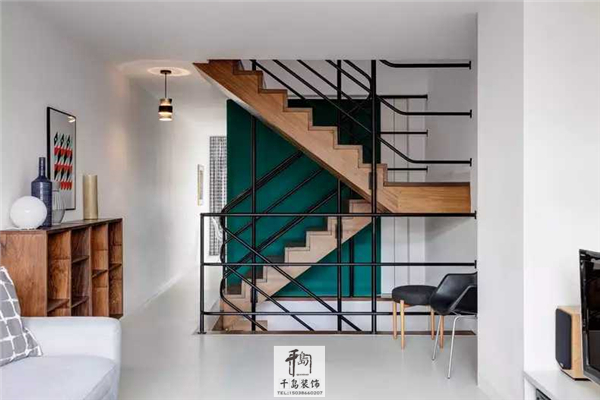 采光條件較差的樓梯空間,墻面被刷上了青綠色,進(jìn)一步凸顯出棕木色樓梯的原木質(zhì)感,并在黑色扶手與白色墻面之間起到了過渡作用。美美的墻邊柜空間也少不了小清新色彩裝飾畫的點(diǎn)綴。