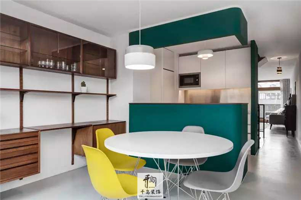 可以看到整個(gè)空間的鮮亮色彩不會(huì)超過三種,在統(tǒng)一中尋求獨(dú)立個(gè)性,黃白混搭的餐椅,部分刷上青綠色漆的櫥柜吧臺,在與留白之間的色彩切換,充滿節(jié)奏感。