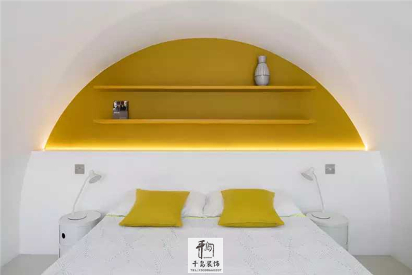 以白色為主色的筒形拱頂臥室,芥末黃的枕頭和墻面還有置物架,都為這個(gè)休息空間增添了許多的生氣。