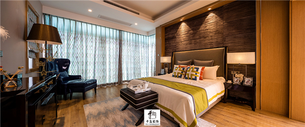 主臥室可以選擇對(duì)比圖案并且有絲綢感的窗簾及布藝。其中藍(lán)色造型的布料可以做大面積窗簾使用,那么整個(gè)臥室的感覺(jué)就是比較奢華,而且舒適。