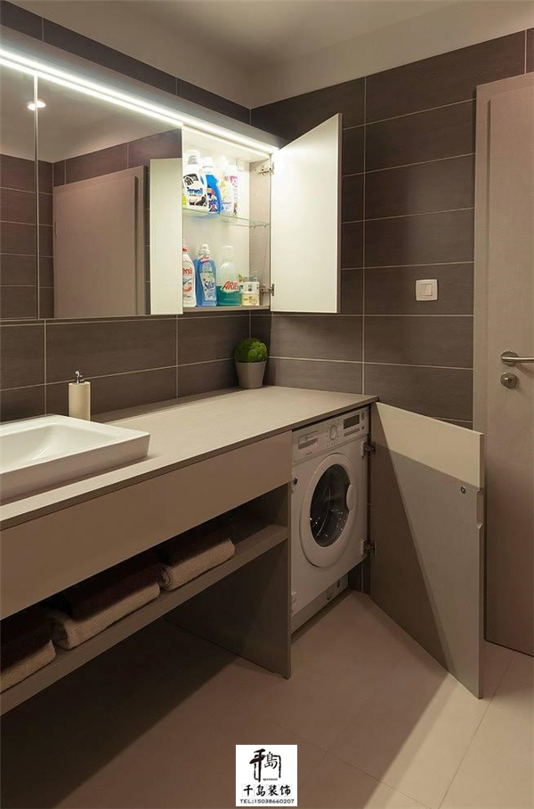 小戶型的衛(wèi)浴間比較小,而且還和臥室相連,衛(wèi)生間里的物品十分的多,像洗衣機這樣的大型電器一定要想好位置放置,所以衛(wèi)浴的收納變得尤為重要,整齊的收納隔柜,讓毛巾和家中的瓶瓶罐罐都有了容身之所,十分的貼心。