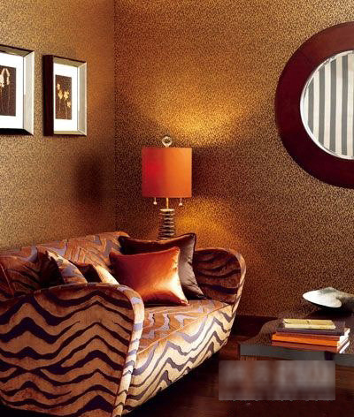 造型獨(dú)特的斑馬紋沙發(fā)透著奢華,紅色的臺燈有一種宮燈的韻味,在柔和的燈光和暖色墻紙的烘托下,讓客廳里的奢華氣氛慢慢彌散晚開來。