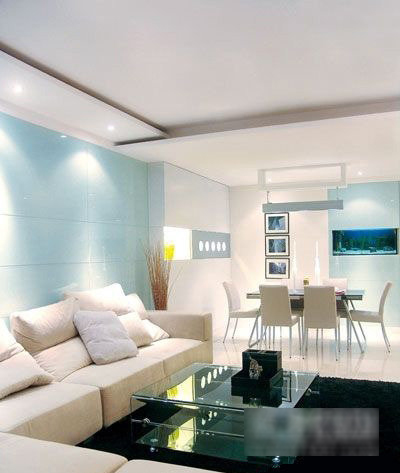 在這個客廳中,吊頂上的小射燈有效補(bǔ)充了光線,同時在沙發(fā)背景墻上形成一道美麗的弧形光暈。