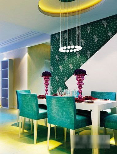 餐廳的家具布置簡潔,燈光的變幻使得開放式的空間獨(dú)立且充滿情趣。內(nèi)凹式的圓形吊頂內(nèi)壁采用了黃色的燈槽裝置,形成弧形光暈,籠罩了整個餐廳空間。