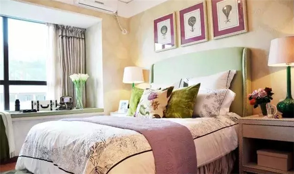 抹茶綠的軟包床搭配薰衣草紫的床品和掛畫,用淺米色墻紙鋪墊,淡淡的花香縈繞臥室,不想睡個(gè)好覺都難。